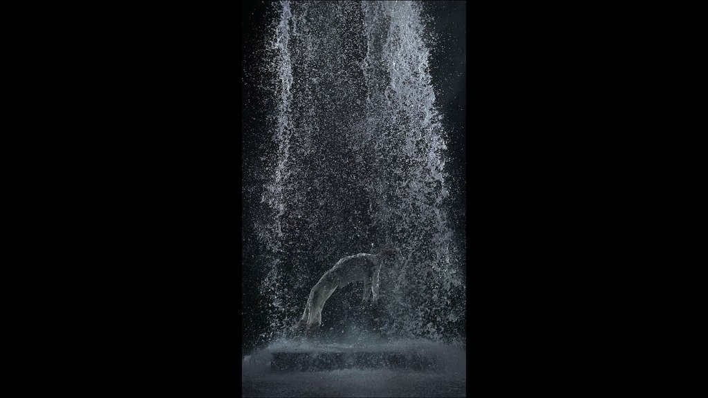 I personally had a transcendent experience when first seeing his piece Tristan’s Ascension. In a huge pitch black room, a gargantuan screen in the form of a monolith soars up to the ceiling, high above our heads. Ethereal sounds fill the room, and seem to come from everywhere around us. On the bottom of the screen, a man is laying on an altar, still. Everything around him is dark, there seems to be no sign of life. This deathly visual environment contrasts with the lively sounds of birds singing. Soon enough an ominous, strange whisper reaches our ears, as water starts ascending from the ground up, in a straight line through the gigantic screen. As time goes by, at an incredibly slow pace, the water comes up massively, filling the screen with beautiful splashes of blue, and the laying figures starts ascending.