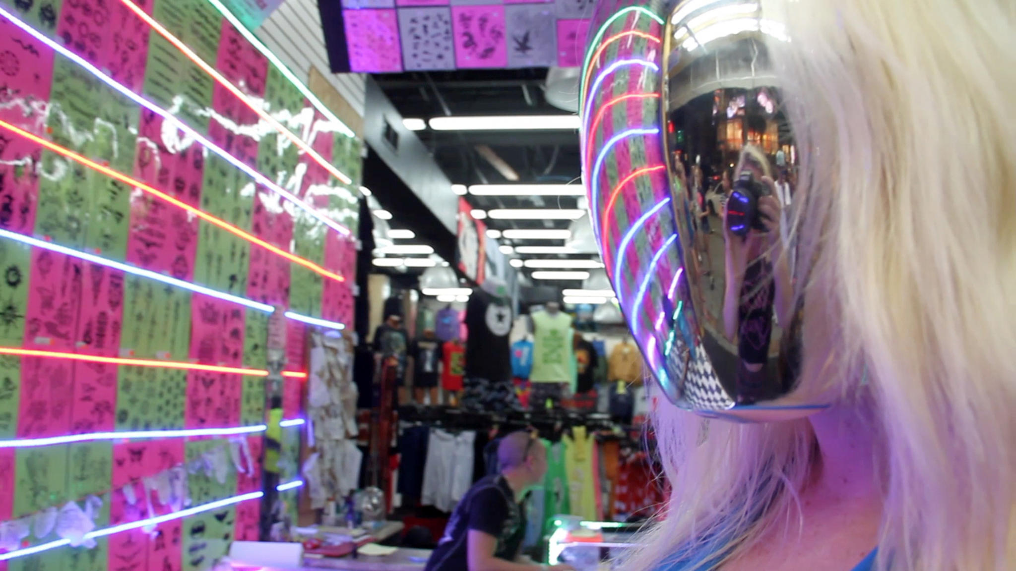 In the film American Reflexxx, she performs a sexualized woman with a mask made out of mirrors. As she ascends a busy street in Myrtle Beach, her faceless, open sexuality attracts some malevolent curiosity. The faces around her are either predatory, judgemental, or glaring with hate. Quickly, things degenerate and she is subjected to insults, groping and assault. When she falls to the ground, we can feel her helplessness in front of this crowd.